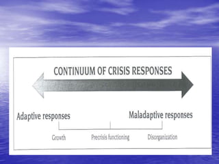 A crisis is perceived as an intolerable difficult situation exceeding one's coping abilities. Crisis intervention provides emergency support to help the individual cope before deterioration. It involves assessing the stressor, individual in crisis, and providing aid. The goal is to stabilize functioning and develop new coping strategies. Assessment evaluates risk factors, and intervention draws on the individual's strengths and external resources to restore pre-crisis equilibrium.
