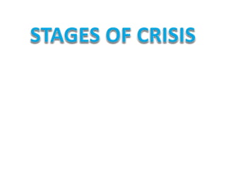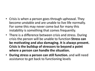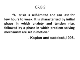 Crisis is characterized by an initial rise in anxiety and tension, followed by problem-solving efforts. It is acute rather than chronic and has the potential for psychological growth or deterioration. Crisis intervention aims to reduce distress, help individuals return to pre-crisis functioning, provide understanding of precipitating events, and initiate new coping responses. The intervention involves assessment, planning, active intervention including reality-oriented discussion and limit-setting, and evaluation of resolution and follow-up planning.