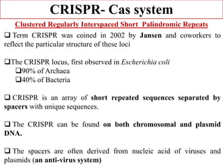 CRISPR-Cas systems provide bacteria with acquired immunity against viruses and plasmids. CRISPR loci contain repeating sequences separated by unique spacer sequences that are derived from invading genetic elements. Cas proteins process CRISPR RNA transcripts from the loci into small CRISPR RNAs that guide the degradation of invading nucleic acids based on sequence complementarity. This three-stage CRISPR-Cas immune response of adaptation, expression, and interference integrates new spacers and uses CRISPR RNAs to target matching foreign genetic elements. CRISPR-Cas systems are found in many bacteria and archaea and can be exploited for applications like bacterial typing, evolution studies, and generating phage resistance.