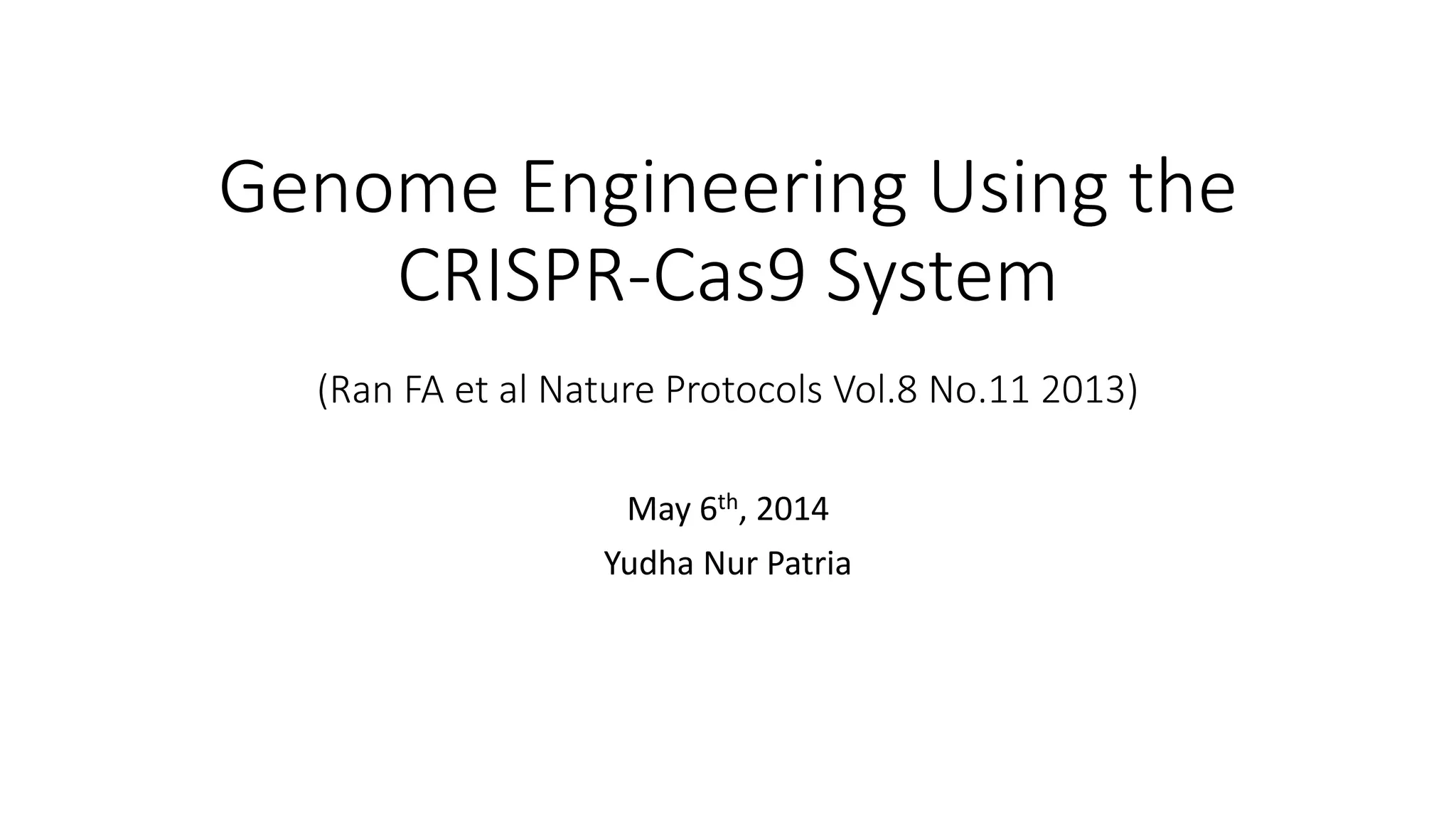 CRISPR-Cas9 is a powerful tool for genome engineering. The document provides guidance on using CRISPR-Cas9 to modify genomes. It describes: 1) Designing single guide RNAs (sgRNAs) to target specific gene loci using online tools; 2) Constructing plasmids expressing Cas9 and sgRNAs; 3) Validating plasmid function using assays like Surveyor nuclease; and 4) Transfecting cells, isolating clones, and further validating genome edits through sequencing. The goal is to use this method to precisely modify genomes for research applications.