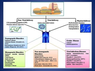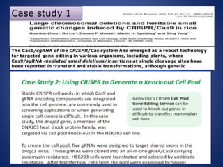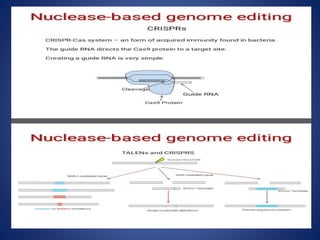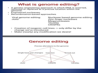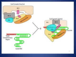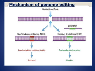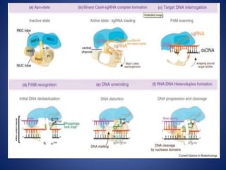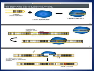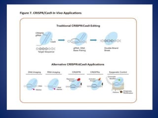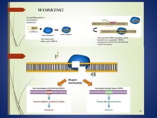 The document provides an overview of the CRISPR/Cas9 gene editing technology. It discusses the history and components of the CRISPR system, how it works, applications in various fields like microbiology, biomedicine, agriculture, and therapeutics. Recent advances expand its use for transcriptional regulation, epigenetic editing, and live imaging. While powerful, it faces challenges like off-target effects that require further research to optimize its safe and ethical application.