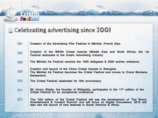 The 12th Cristal Festival will take place from December 12-16, 2012, in Crans Montana, Switzerland, celebrating the evolution of advertising since 2001. The event includes a focus on brand entertainment and digital innovations, with various competitions, workshops, and networking opportunities designed for industry professionals. The festival has achieved significant growth over the years, attracting over 1000 delegates and 3000 entries, highlighting its status as a key gathering for the advertising and media sectors.