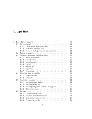 Documentul oferă un curs practic de Java, cuprinzând o introducere în limbajul de programare, structura acestuia, și elementele fundamentale precum tipurile de date, controlul execuției și gestionarea excepțiilor. De asemenea, sunt prezentate conceptele de obiecte și clase, interfete, și fluxuri de date. Cursul are scopul de a familiariza cititorul cu programarea Java, acoperind atât principiile teoretice, cât și aplicații practice.