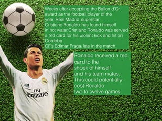 Cristiano Ronaldo received a red card for a violent kick against Edimar Fraga during a match, which may lead to a suspension of two to twelve games. Neymar has called for maximum punishment from Spanish football authorities due to the severity of Ronaldo's actions. Following the incident, Ronaldo apologized to his fans and Edimar for his behavior.