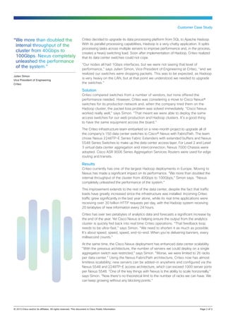 Criteo, a digital advertising company, leverages advanced analytics and a personalized ad delivery system to enhance user engagement by predicting consumers' browsing intentions in real-time. To handle increasing data and improve throughput, Criteo upgraded its infrastructure with Cisco Nexus switches, more than doubling its Hadoop cluster throughput from 40 to 100 Gbps and enhancing scalability and resilience. This transition allows Criteo to efficiently manage vast amounts of analytics data, facilitating rapid feedback loops necessary for delivering personalized advertisements with minimal latency.