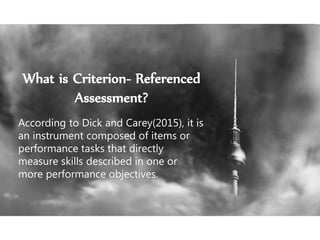 This document provides an overview of criterion-referenced assessment and test development during instructional design. It discusses four types of criterion-referenced tests: entry skills tests, pretests, practice tests, and posttests. Objective tests are one of the most popular testing formats described. The document also covers alternative assessments like rubrics and portfolio assessments, noting key criteria for developing these tools.
