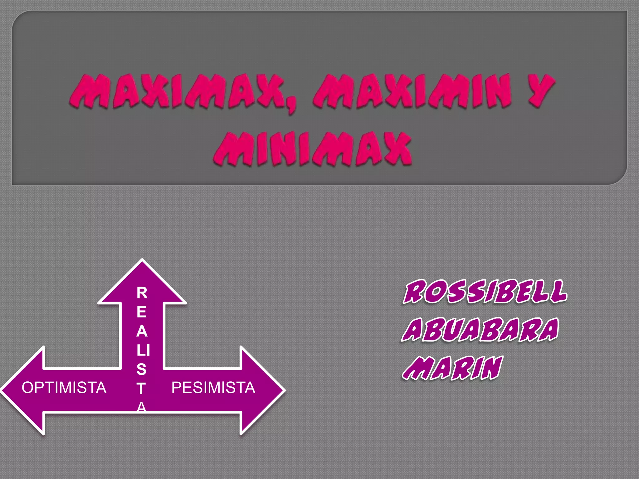 El documento explica tres criterios de decisión bajo incertidumbre: maximax, maximin y minimax. Maximax es el criterio optimista que busca maximizar el pago máximo posible. Maximin es el criterio pesimista que busca maximizar el pago mínimo posible. Minimax es el criterio que busca minimizar el arrepentimiento o pérdida de oportunidad posible al elegir una opción subóptima.