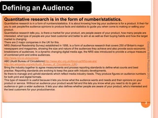 The document discusses quantitative and qualitative audience research methods. Quantitative research uses numbers and statistics to determine the size and characteristics of the target audience. It answers questions like how many people are interested in the product. Qualitative research uses methods like focus groups, interviews, and questionnaires to get an in-depth understanding of the audience's preferences, likes, and dislikes. Together these research methods help define the target audience and their needs to ensure the product is appealing and successful.
