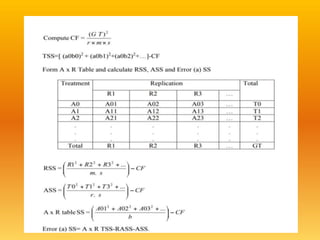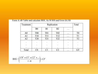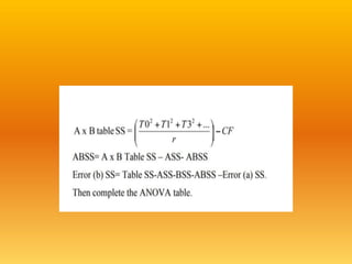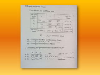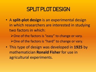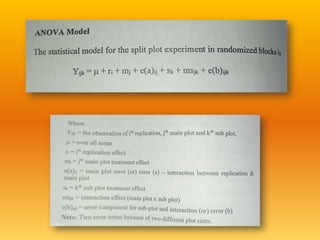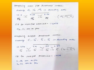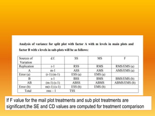The document discusses two experimental designs: split-plot design and strip-plot design, detailing their characteristics, applications, and critical differences. The split-plot design allows for the study of two factors, one being easily changeable and the other not, while the strip-plot design is employed when both factors require large plot sizes. It also covers statistical concepts like critical difference and confidence levels in analyzing treatment effects on yield.