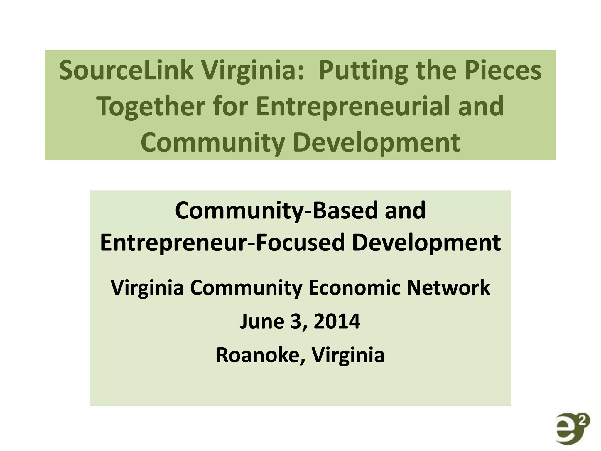The document discusses community-based and entrepreneur-focused economic development strategies. It notes that Virginia has experienced strong but uneven growth, and that entrepreneurs will be key to future success. It advocates for a "ground game" approach involving communities as partners in development. Lessons from initiatives in Kansas emphasize long-term collaboration and community engagement. Building blocks for success include statewide infrastructure and resources paired with local coaching and entrepreneur identification. Assessments help communities craft strategies, and tracking impact is important. Case studies illustrate how some communities have experienced renewal through focused entrepreneur support.