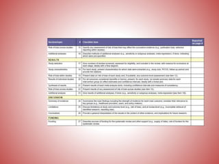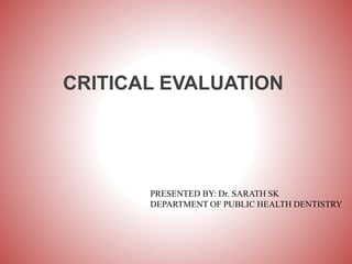 This document provides an overview of critical evaluation of scientific papers. It discusses critical reading, the components of a critical evaluation including critical appraisal and reflection. It describes how to evaluate different sections of a scientific paper such as the title, abstract, introduction, methodology, results, discussion and conclusion sections. Key aspects of methodology like study design, sampling strategy, and measurement instruments are explained. The document emphasizes evaluating the internal and external validity of studies in a critical manner.
