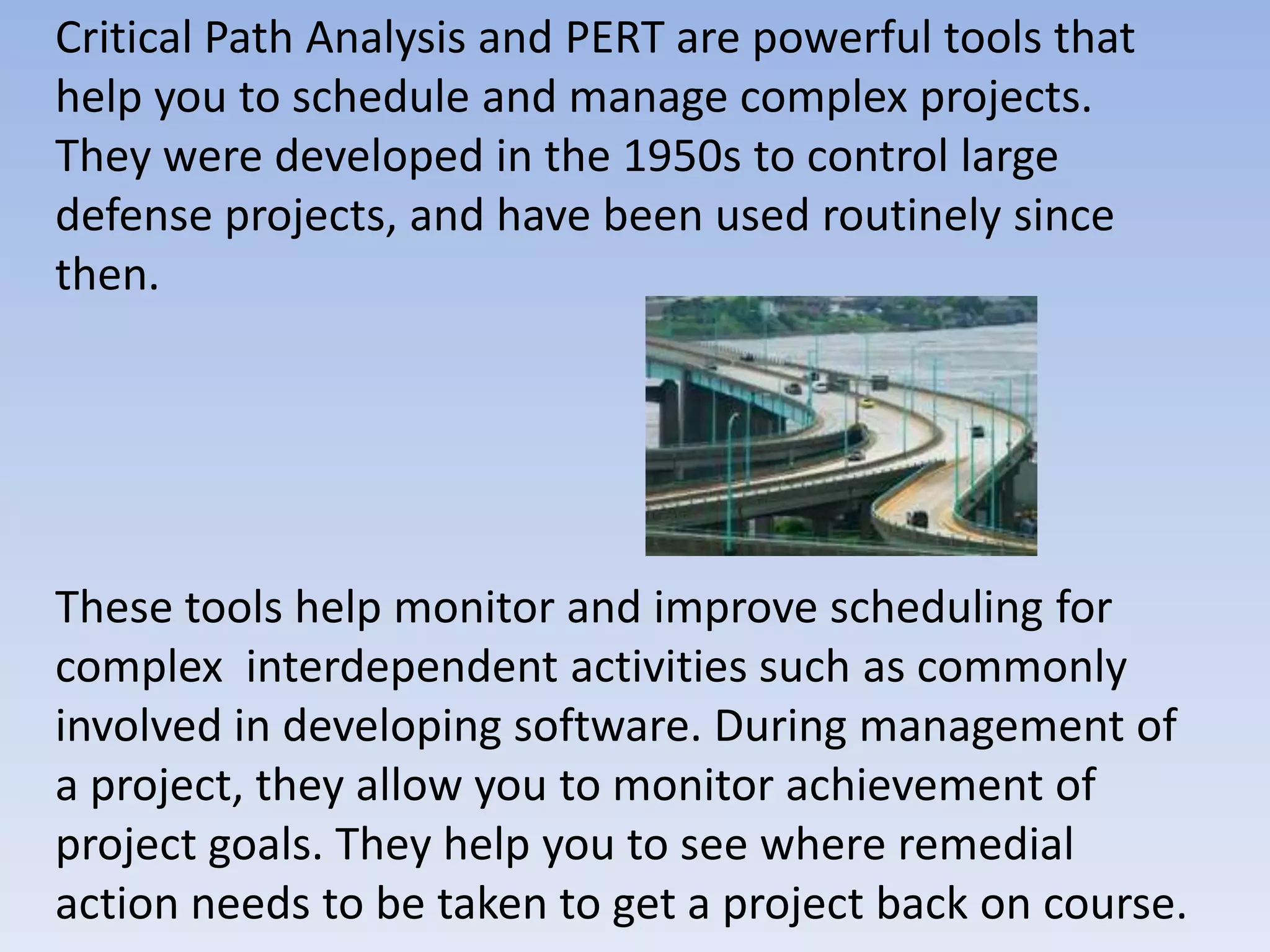 Critical Path Analysis (CPA) and Program Evaluation and Review Technique (PERT) are project management tools used to schedule complex projects. CPA identifies the critical path of tasks that must be completed on time for the project to finish on time. It also identifies non-critical parallel tasks. PERT is similar but takes a more conservative approach to estimating task durations. Both help project managers monitor progress and determine where to take remedial action if the project falls behind schedule.