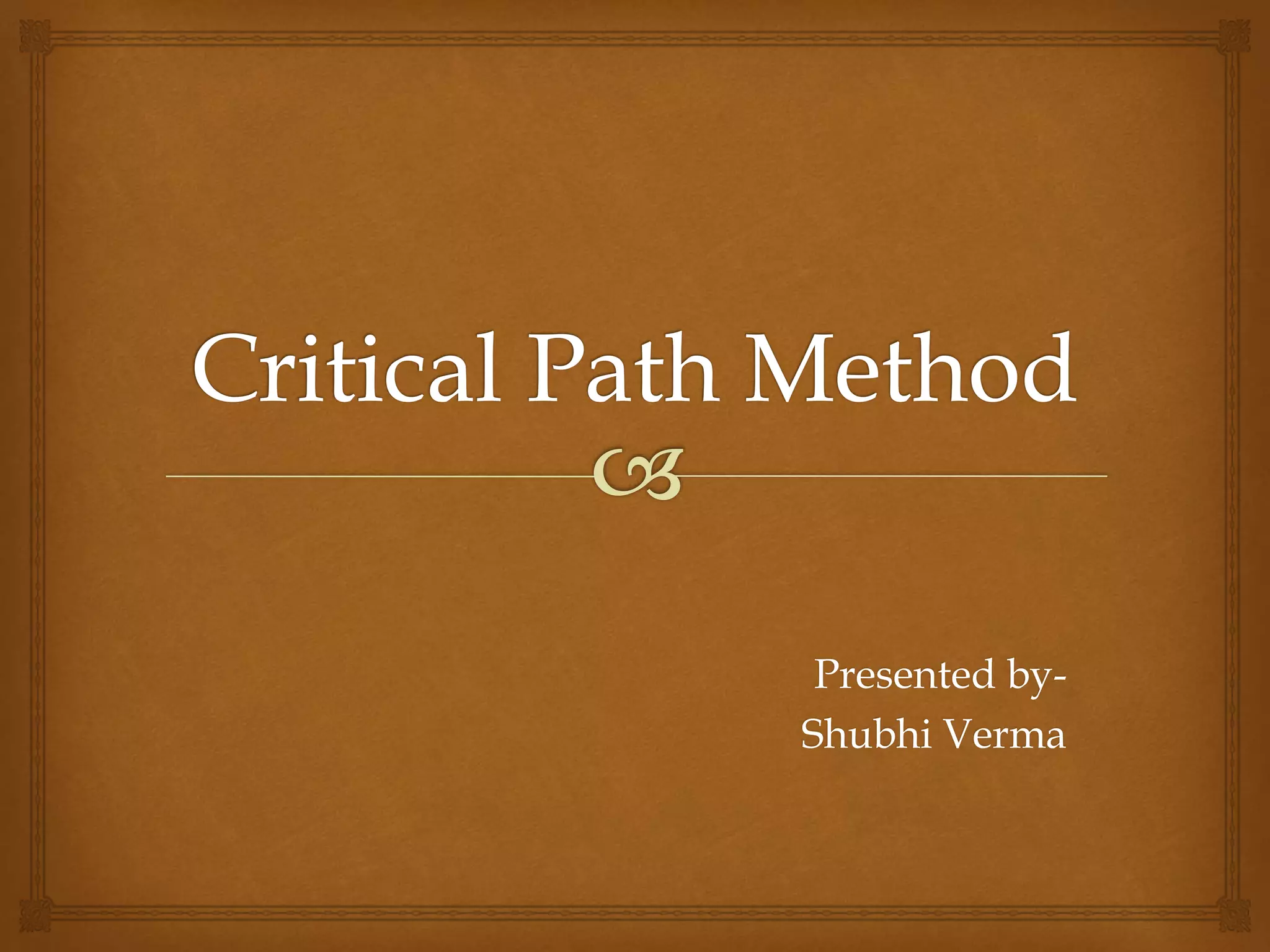 The critical path method (CPM) is a project management technique used to schedule tasks and identify the critical path of tasks that must be completed on time to meet deadlines. The critical path is the longest sequence of tasks in a project, where a delay in any critical path task will delay the entire project. CPM involves specifying tasks, determining dependencies, drawing a network diagram, estimating task times, and identifying the critical path to determine the shortest possible project duration. It helps project managers identify important tasks, reduce project timelines, and compare planned vs actual progress.
