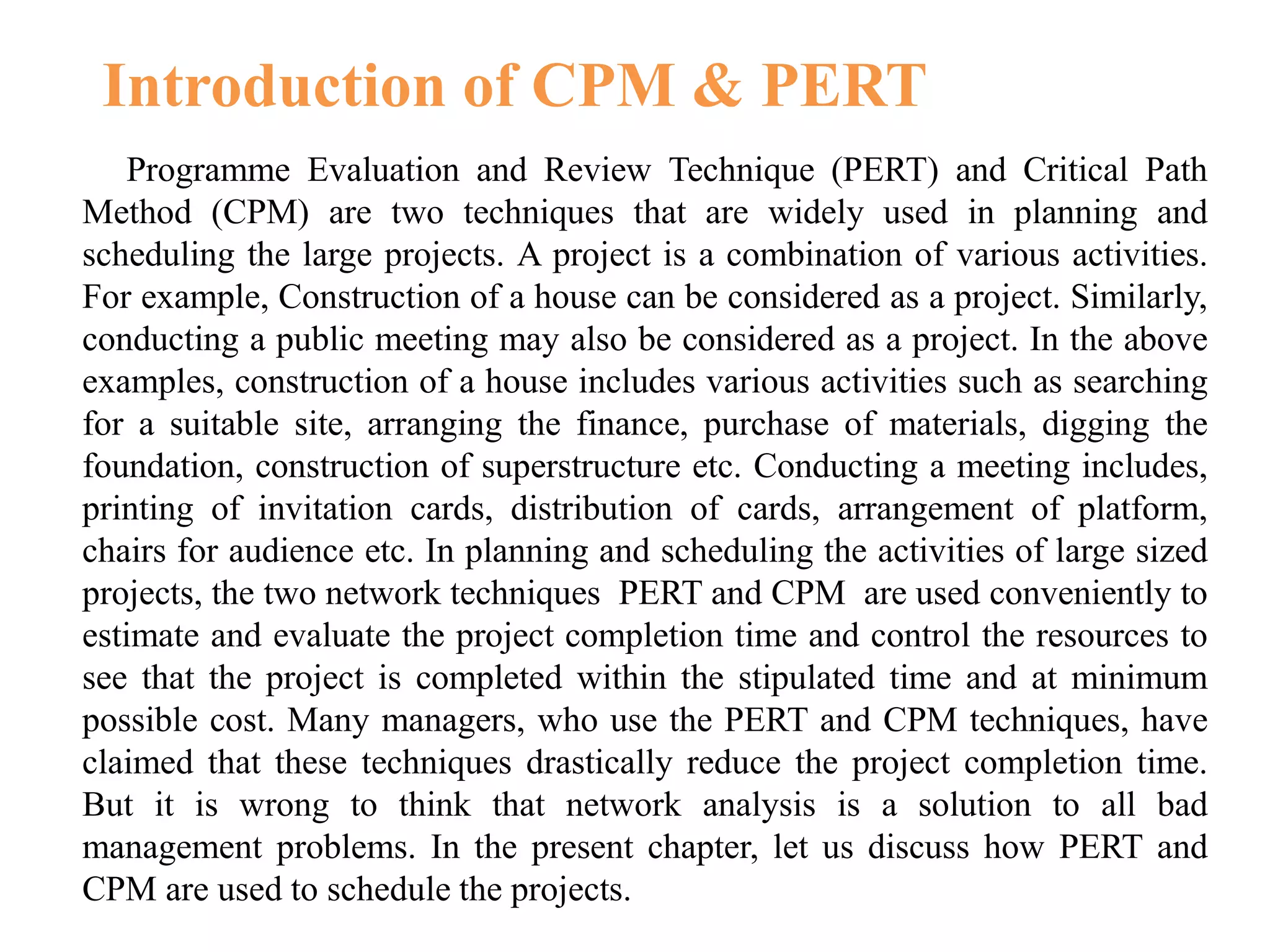 The document discusses critical path method (CPM) and program evaluation and review technique (PERT) for planning and scheduling large projects. It explains that a project consists of various activities connected logically in a network. CPM and PERT help estimate project completion time, control resources, and reduce completion time. The key differences between CPM and PERT are that PERT uses probabilistic activity times and three estimates while CPM uses fixed times and is activity-oriented rather than event-oriented. The document also outlines the steps for writing a project network.