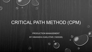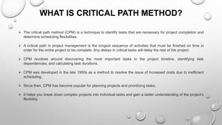 The Critical Path Method (CPM) is a project management technique used to identify essential tasks, their dependencies, and scheduling flexibility to ensure timely project completion. Developed in the late 1950s, CPM helps in efficient resource management and avoiding bottlenecks by breaking down projects into manageable activities, thereby facilitating better future planning. This document also elaborates on technical terms related to CPM, such as critical activities, float, and methods for calculating the critical path through examples and case studies.