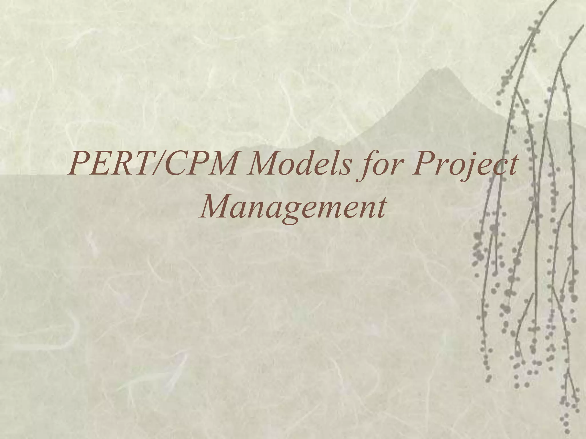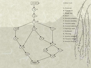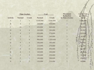 This document discusses project management techniques like PERT and CPM. It uses an example of a construction company, Reliable, that was contracted to build a plant within a year. Key steps in PERT/CPM include identifying activities, precedence relationships, and time information to build a project network. The critical path is the longest path through the network and determines the shortest project duration. Crashing activities can reduce time but increases costs, so trade-offs must be considered. Marginal cost analysis and linear programming can help optimize crashing decisions.