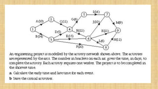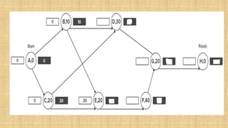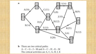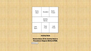 The Critical Path Method (CPM) is a technique for scheduling a set of project activities. It identifies the longest continuous chain of activities from start to finish required to complete the project on time. This longest chain is called the critical path. CPM calculates the earliest and latest times each activity can start and finish without making the project longer. Activities on the critical path have no scheduling flexibility, while other activities have "float" or slack time that can be used for scheduling flexibility. CPM is useful for determining the minimum project duration and identifying which activities must be carefully managed and monitored to avoid project delays.