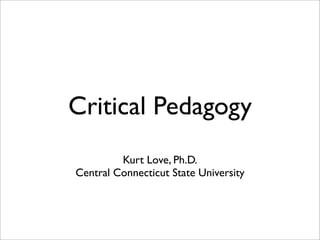Critical pedagogy focuses on understanding and disrupting power imbalances in education, especially related to issues of race and class. It draws from critical social theory and aims to provide a liberating education that allows students to question relationships of power and oppression in society. Key principles include examining class struggle and cultural capital, reading social justice issues in the world rather than just texts, and naming processes that promote hegemony. Teachers identify generative themes raised by students to guide classroom investigation.