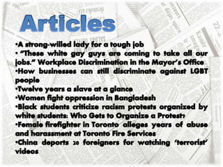 The document highlights various social issues, including the struggles of women facing discrimination, LGBTQ+ employment rights, and the historical narrative of Solomon Northup's enslavement. It discusses the persistence of sexual violence and sexism in Bangladesh, racial protests in universities, and workplace harassment faced by women. Additionally, it touches on the controversial deportation of tourists in China due to misunderstandings related to potential extremism.