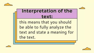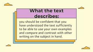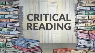 The document outlines the objectives of the lesson on critical reading, defining it as a form of reasoning that involves evaluation, analysis, and interpretation of texts. It contrasts linear and non-linear texts, discusses the roles of hypertext and intertext, and emphasizes the importance of questioning assumptions and examining the validity of information. Furthermore, it includes guidelines for assessing critical reading through activities, questions, and criteria for evaluating understanding and team participation.
