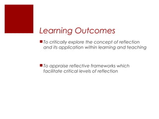 This document discusses reflection in learning and teaching. It defines reflection as a process of reviewing experiences to describe, analyze, evaluate, and inform future practice. Several frameworks for reflection are presented, including those by Dewey, Kolb, Schon, and Hatton and Smith. The document notes that while reflection is commonly used, definitions vary and it can be a complex process. Effective reflection involves critical thinking, identifying assumptions, and considering alternatives. Reflective frameworks and strategies can help teachers and students learn from experiences and continue developing.
