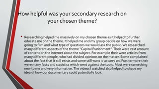 The pre-production process for the documentary went well, as the group planned what facts and interview questions they would include. Filming the documentary presented some challenges, such as noise interference and difficulty finding interview subjects due to the controversial topic. While the documentary included a variety of locations, opinions, and time-lapse footage, weaknesses included too many transitions, low audio quality without a microphone, and poor lighting in some shots. Feedback noted both strengths like the concept and areas for improvement such as transition usage and separating facts from the narrative.