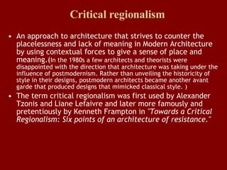 Critical regionalism is an architectural approach that counters placelessness in modern architecture by incorporating contextual forces to give a sense of place and meaning. It was first defined by Alexander Tzonis and Liane Lefaivre, and further developed by Kenneth Frampton. Critical regionalism adopts modern architecture's progressive qualities but also values responses particular to the local context, with emphasis on elements like climate, topography, and materials rather than visual styles. It differs from regionalism by consciously engaging with universal principles rather than directly copying vernacular architecture. Examples of critical regionalism include works by Alvar Aalto, Jørn Utzon, and other architects who mediated universal and local influences.