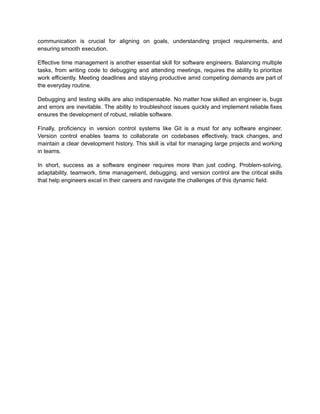 To excel in software engineering, professionals must develop critical skills beyond technical expertise, including problem-solving, adaptability, teamwork, time management, debugging, and proficiency in version control systems like git. Continuous learning is essential due to the fast-paced evolution of technology, while effective collaboration and clear communication within cross-functional teams are also crucial for success. Mastering these skills enables engineers to navigate industry challenges and work on complex projects efficiently.