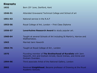 This document provides a biography and overview of the art career of British pop artist Peter Blake. It discusses his early work focusing on circus scenes and childhood themes. It describes how he was influenced by American pop artists Robert Rauschenberg and Jasper Johns in the 1950s to incorporate collage techniques and depictions of popular culture. The document also mentions Blake co-founding the Brotherhood of Ruralists artist group in 1975 and his continued use of collage in more recent decades depicting memories and experiences through collected items. Suggestions are provided for using Blake's art in art education lessons focusing on techniques like collage, color, and composition.