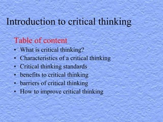 The document provides an introduction to critical thinking, defining it as the disciplined process of analyzing and evaluating information to guide beliefs and actions. It outlines characteristics of critical thinkers, the standards for critical thinking, its benefits in academic and daily life, and common barriers that impede effective critical thinking. Additionally, it offers strategies for improving critical thinking skills.