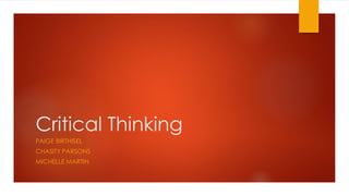 This document discusses critical thinking and ways to implement it in the classroom using technology. It defines critical thinking as actively conceptualizing, applying, analyzing, synthesizing, and evaluating information to reach a conclusion. The document recommends tools like podcasts, YouTube videos, Photoshop, QR codes, and web quests to get students to analyze information from different perspectives. It also provides examples of using blogs and videos to promote critical thinking about topics like trees and the environment. The conclusion states that critical thinking aids students by helping them think independently and consider various points of view.
