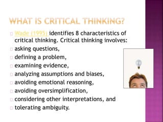 The document discusses critical thinking and creative thinking. It defines critical thinking as involving asking questions, defining problems, examining evidence, analyzing biases, avoiding emotional reasoning, considering other interpretations, and tolerating ambiguity. Creative thinking means generating new ideas and processes. The two types of thinking are interrelated, with critical thinking helping to evaluate creative ideas in a rational way. The document provides tips for using critical thinking to spur more creative thinking, such as questioning experts and their qualifications, avoiding overgeneralizations, and considering unexpected outcomes as opportunities for new ideas.