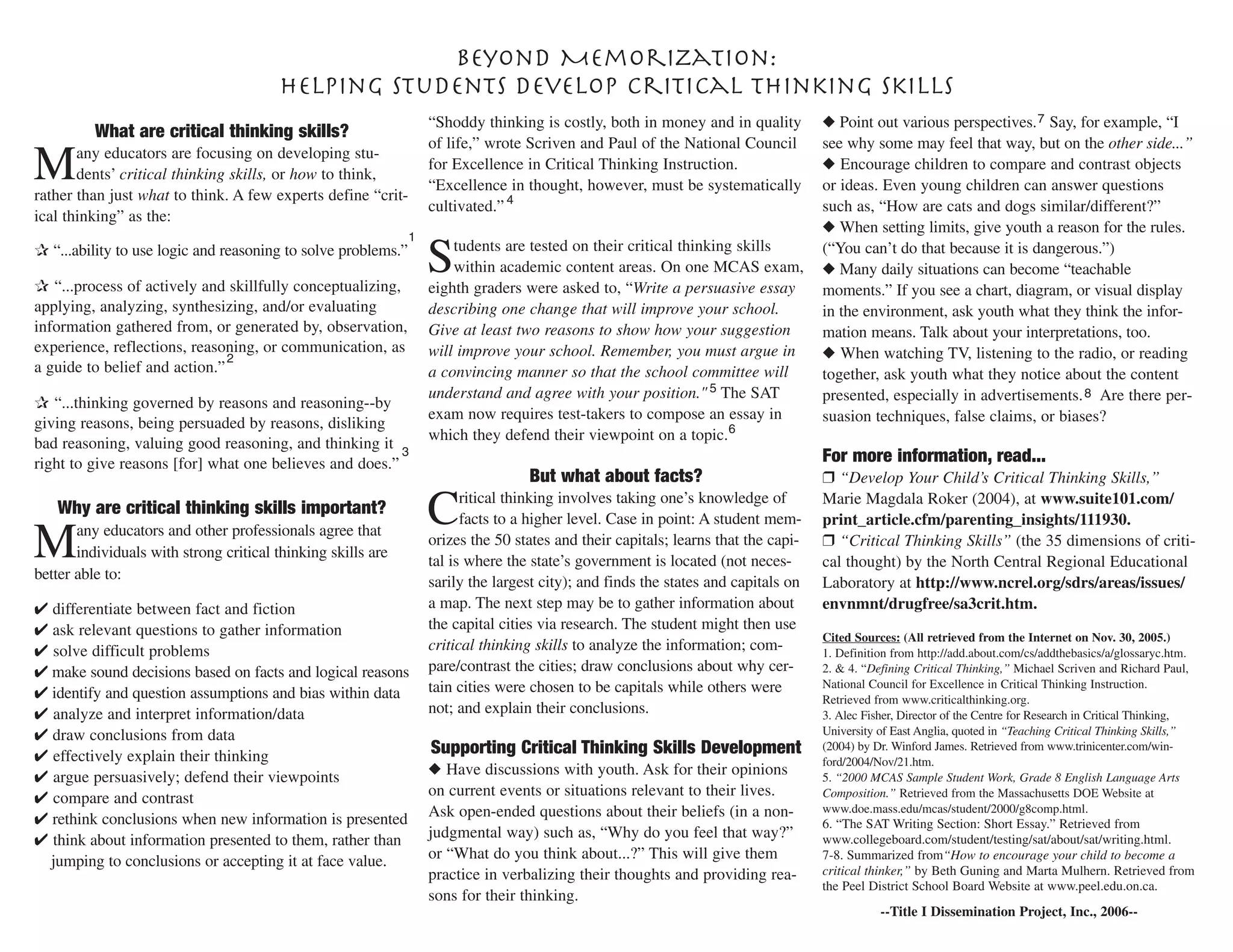 Critical thinking skills involve using logic and reasoning to solve problems, conceptualize and evaluate information to guide beliefs and actions. Educators are focusing on developing these skills in students to think critically rather than just memorize facts. Strong critical thinking allows people to differentiate facts from opinions, solve problems, make sound decisions, and think critically about information rather than accepting it at face value. Developing these skills in students is important for academic testing and real-world problem solving.