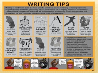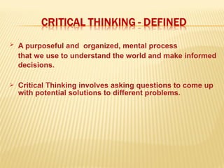The document discusses critical thinking skills and how to apply them academically. It defines critical thinking as a purposeful, organized mental process used to understand problems and make informed decisions. The document provides tips for incorporating critical thinking through active learning, reading and writing. These include asking open-ended questions, evaluating different perspectives, summarizing readings, and improving writing through prewriting, drafting and revising. The goal is to help students better understand material and think more critically in all aspects of their education.
