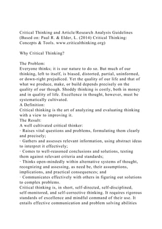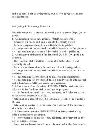 The document outlines critical thinking guidelines, articulating its importance in analyzing and evaluating research for improved outcomes. It provides an assessment framework for research quality and discusses various social science research designs and methods. Additionally, it explores the relationship between globalization and national identity, asserting that globalization doesn't undermine national identification but negatively affects certain national sentiments like patriotism.