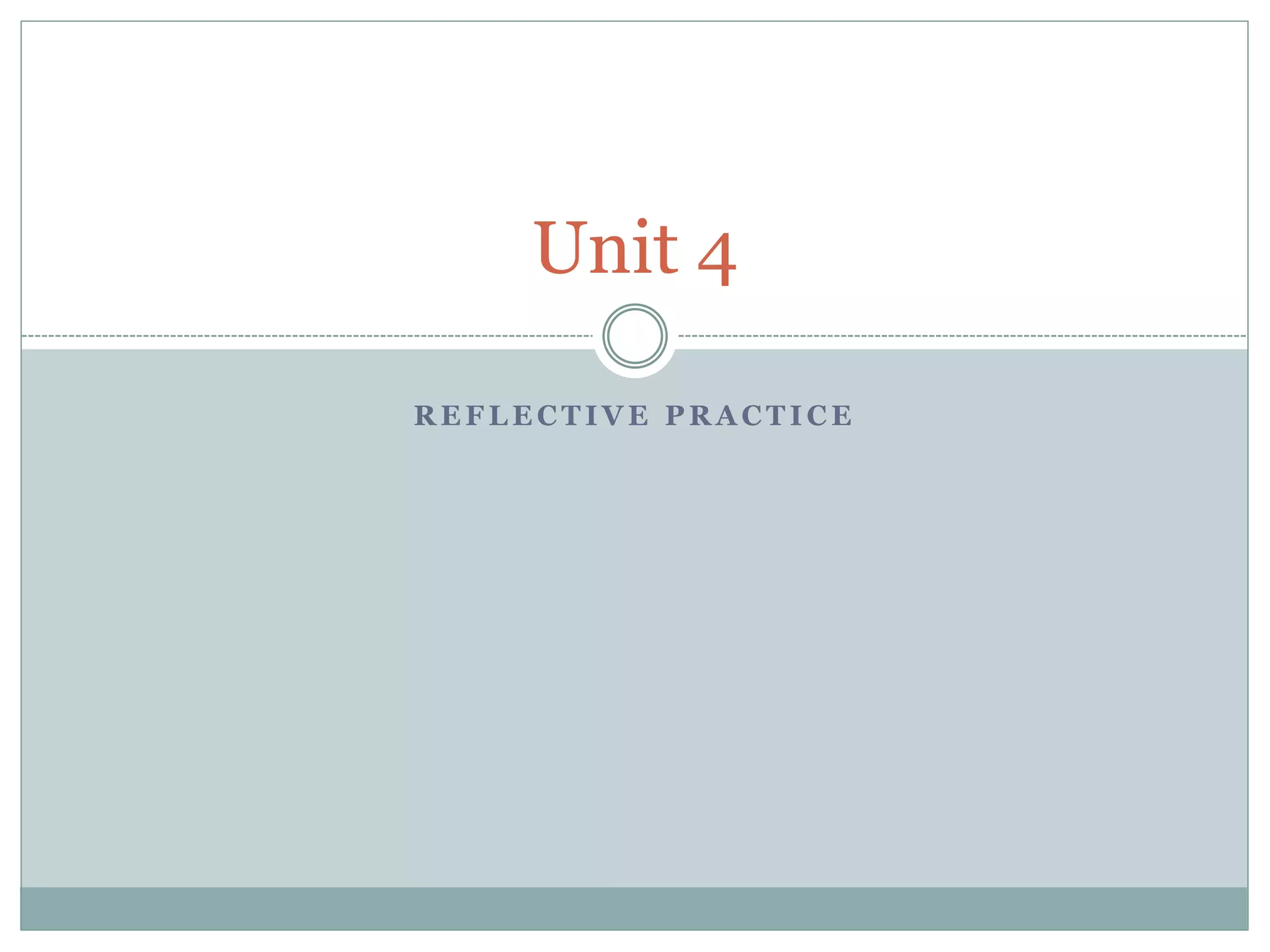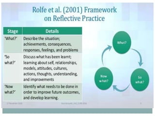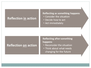 This document discusses reflective practice and different models of reflection. It defines reflective practice as the ability to reflect on actions to continuously improve the learning process. Several influential thinkers on reflection are covered, including John Dewey, Donald Schon, David Kolb, and Stephen Brookfield. Dewey viewed reflection as actively and carefully reconsidering beliefs in light of evidence. Schon focused on reflection occurring both in and on action for professionals. Kolb's model of reflection involves four stages: concrete experience, reflective observation, abstract conceptualization, and active experimentation. Brookfield recommended using four "critical lenses" of reflection: autobiography, students, peers, and theory. Overall, the document emphasizes that reflecting before, during, and after actions