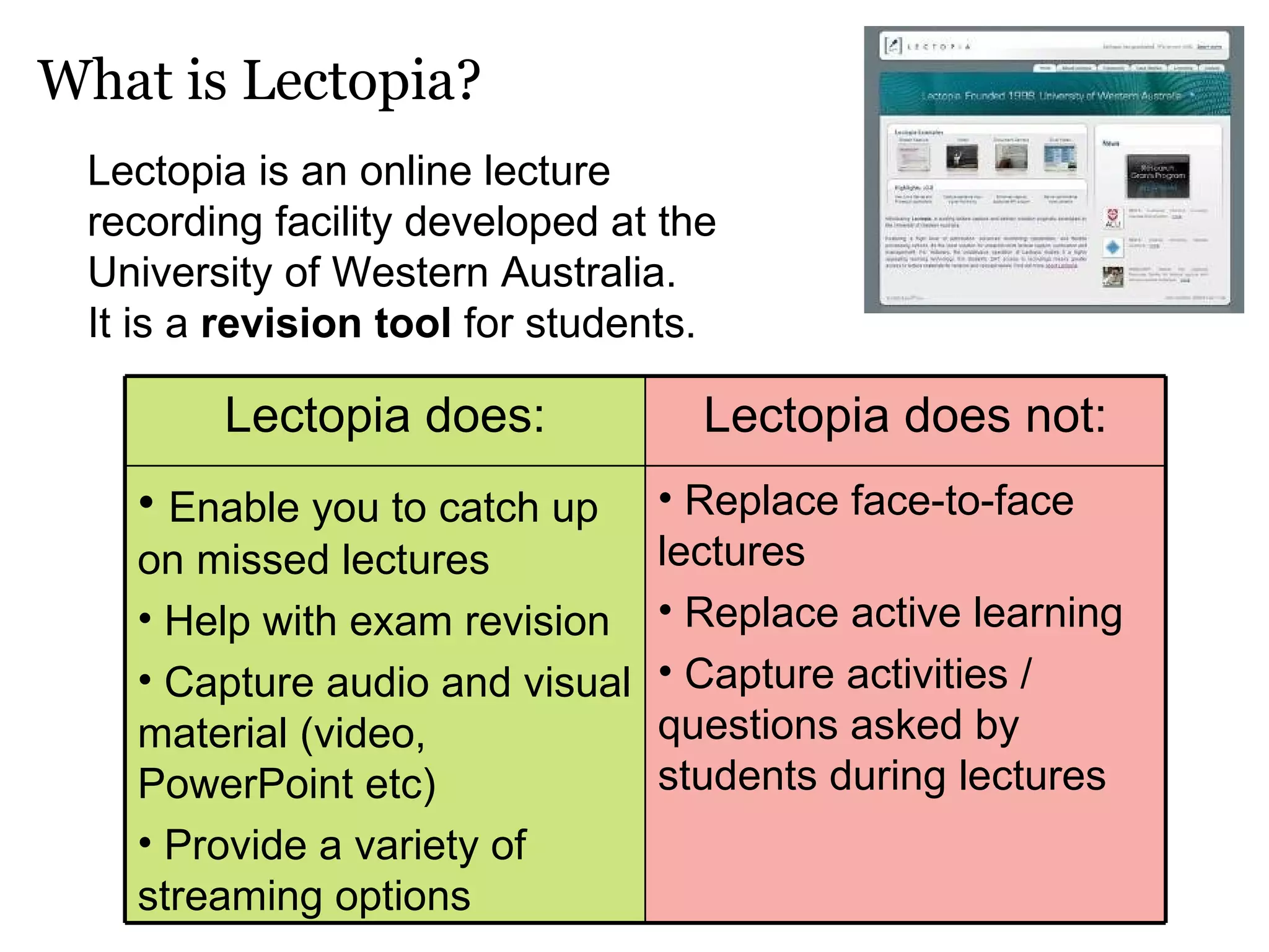 Lectopia is an online lecture recording tool from the University of Western Australia designed to aid students in revising and catching up on missed lectures. The platform supports various learning styles, encouraging verbal learners to summarize ideas and visual learners to utilize diagrams and visual aids. Effective use of Lectopia involves preparing questions, taking strategic notes, and actively engaging with the material to enhance critical thinking.