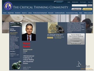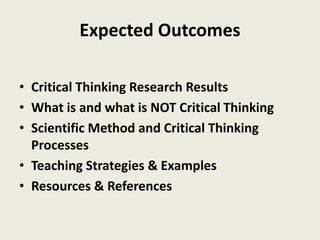 The document explores the concept of critical thinking, its significance in education, and strategies for teaching it effectively. It highlights research findings indicating that many college students struggle with critical thinking skills and emphasizes the need for teaching approaches that foster these abilities. Additionally, it discusses various barriers to critical thinking and provides instructional resources and examples to enhance critical thinking in students.