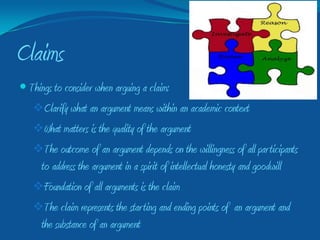 When arguing a claim, it is important to clarify what an argument means academically and address it with intellectual honesty. The claim represents the starting and ending points of an argument. Claims should be phrased as statements, not questions, and should create potential for controversy by challenging the status quo. Properly phrased claims are specific, unbiased, and make the burdens of proof for each side clear. There are three types of claims: claims of fact, value, and policy. Different environments emphasize different claim types and losing focus in an argument can be addressed by reworking the claim or returning to it later.