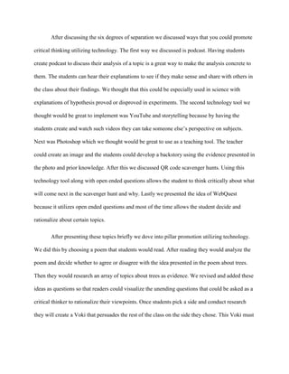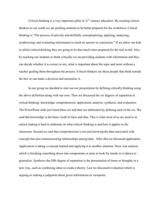 Critical thinking is an important skill that helps students be better prepared for the real world and workforce. It involves actively conceptualizing, applying, analyzing, synthesizing, and evaluating information to reach conclusions. The document discusses how teaching critical thinking develops skills like comprehending relationships among data, applying concepts to new situations, breaking down information into parts, combining ideas, and making judgments. It also provides examples of how technology like podcasts, YouTube, Photoshop, QR code scavenger hunts and WebQuests can promote critical thinking by engaging students in analysis, research, and persuading peers. The presentation discussed defining and applying the six degrees of critical thinking, then concluded by emphasizing that critical thinking helps with different perspectives, creative