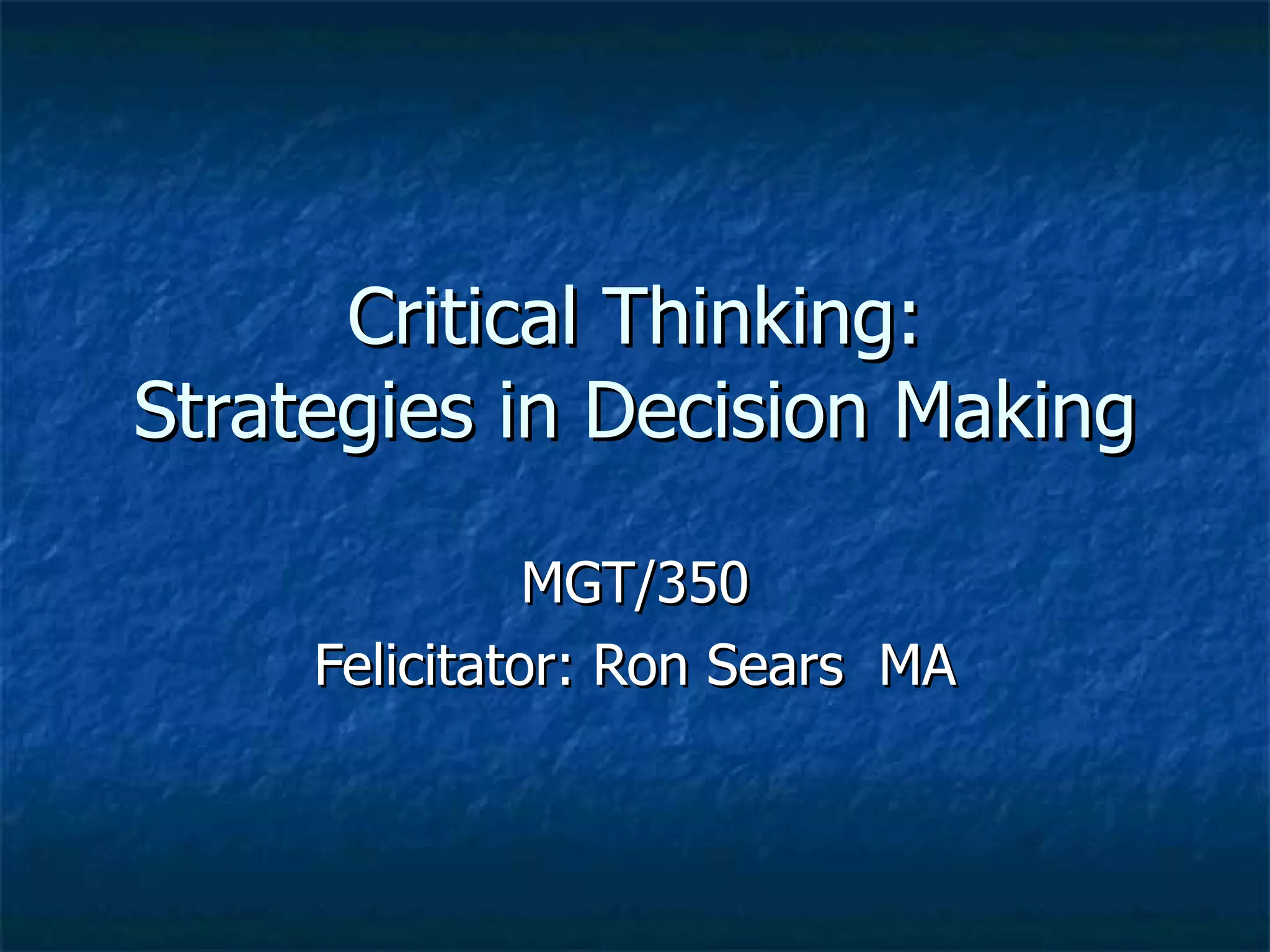 This document provides an overview of a course on critical thinking and decision making. It introduces course objectives, assignments, and key topics that will be covered such as critical thinking skills, decision making processes, identifying assumptions and biases, and overcoming barriers to effective thinking. The document outlines phases of critical thinking and questions students should ask themselves to evaluate arguments and make well-reasoned decisions.
