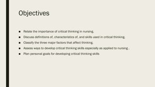 The document discusses the significance of critical thinking in nursing, emphasizing its role in clinical reasoning and decision-making. It outlines various skills, components, and processes that enhance critical thinking while addressing problem-solving strategies. Additionally, the text identifies factors influencing thought processes in nursing practice, providing a comprehensive guide for developing critical thinking abilities.