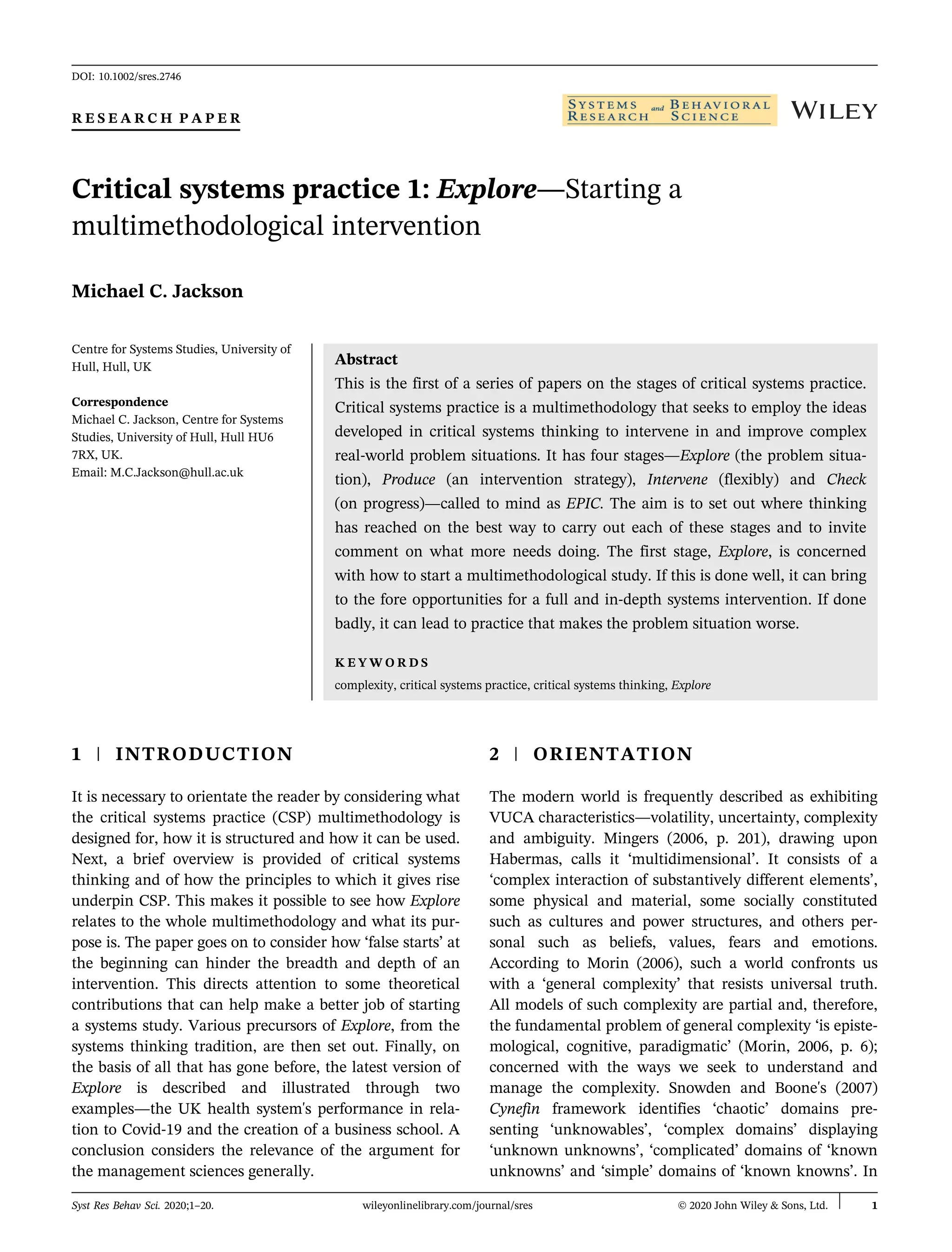 This document summarizes a research paper on the first stage ("Explore") of Critical Systems Practice (CSP), a multimethodology approach for intervening in complex real-world problems. The Explore stage involves starting a multimethodological study of the problem situation. It is important to properly explore the problem upfront in order to identify opportunities for an effective, in-depth systems intervention and avoid approaches that could worsen the problem. The document provides background on CSP and critical systems thinking, and describes the latest version of the Explore stage, illustrating it with examples of applying it to study the UK health system's response to COVID-19 and creating a new business school.