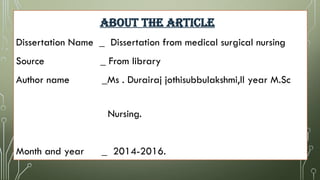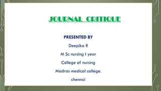 The document critiques a study on the effectiveness of mirror therapy for improving upper limb motor functions in stroke patients, conducted by Deepika R during her M.Sc. nursing program. The study found significant improvements in hand functions, with better outcomes associated with younger, more educated patients without other systemic diseases. The critique highlights both positive aspects and areas for improvement in the research, including the need for a broader sample consideration and the potential inclusion of mental status assessments.