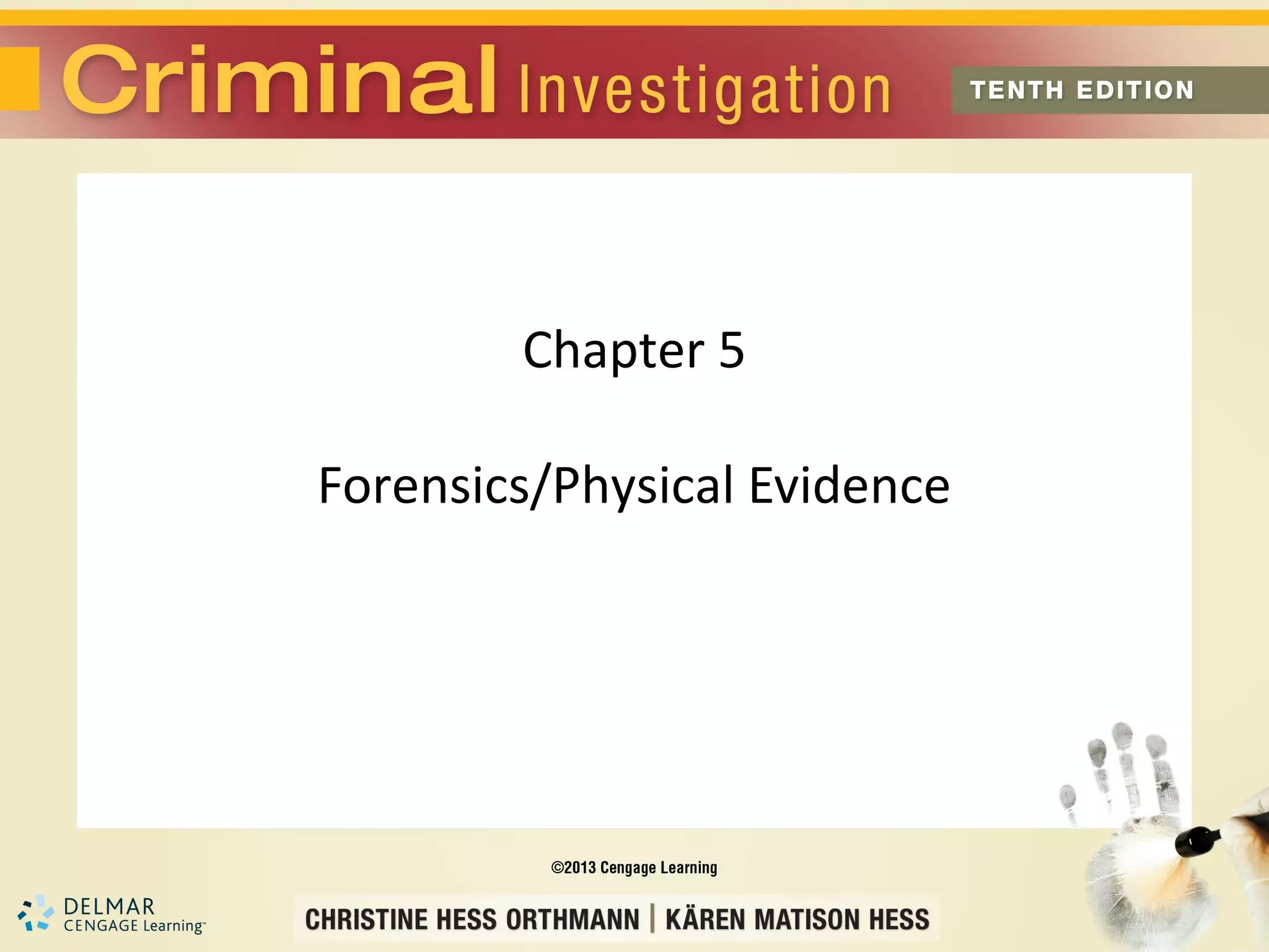 This document discusses the importance of evidence in criminal investigations and proper evidence handling procedures. It covers the evolution of forensic science, categories of evidence like physical and testimonial, equipment for processing crime scenes, and maintaining the chain of custody. Specific evidence types are examined in depth, including fingerprints, DNA, firearms, and documents. Proper packaging, transporting, storing, and documenting the chain of custody of evidence is emphasized.
