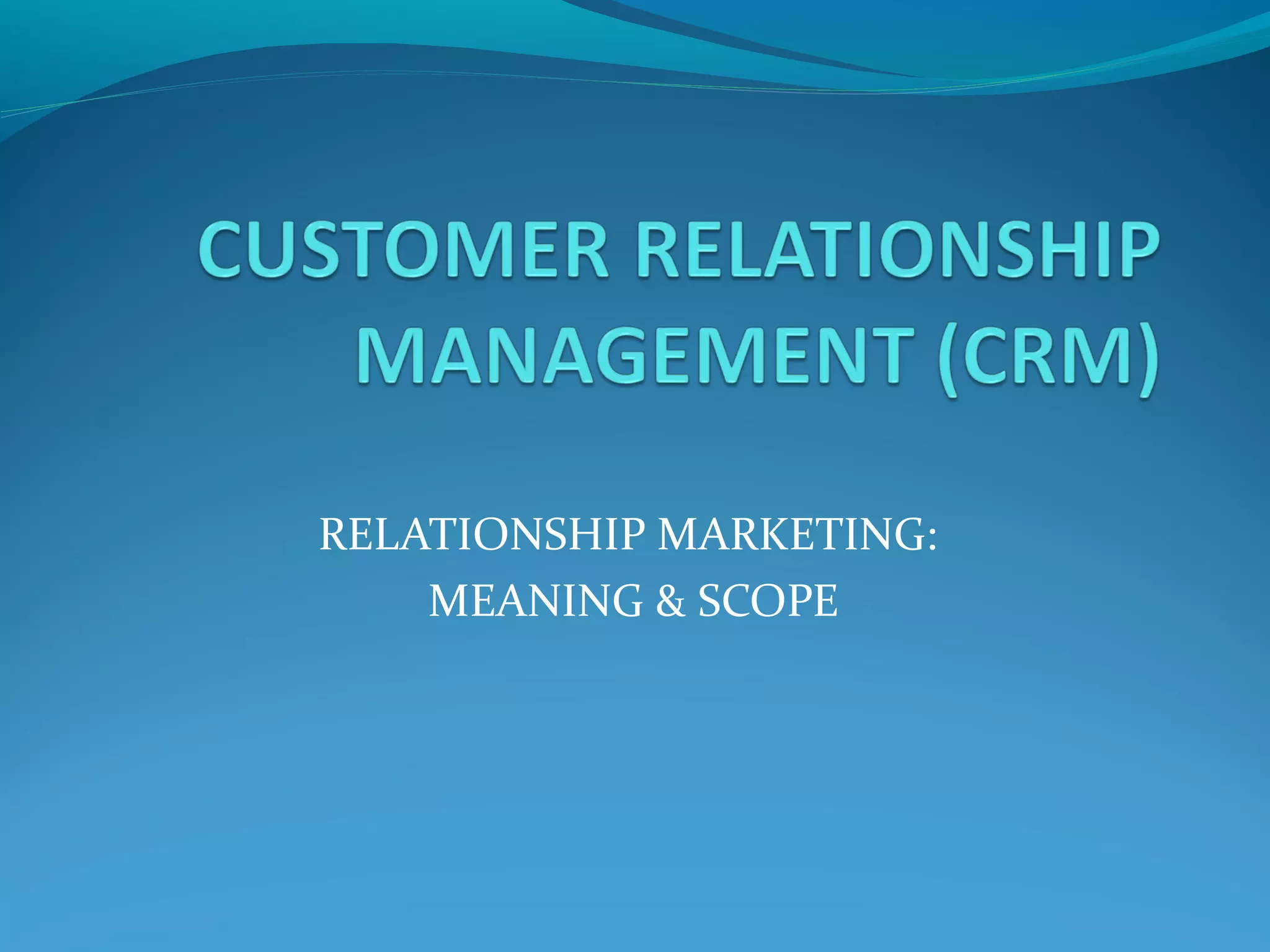 This document provides an overview of relationship marketing and customer relationship management (CRM). It discusses the meaning and scope of relationship marketing, including its focus on building internal and external relationships with key stakeholders. It also outlines the evolution of relationship marketing approaches over time from direct mail to loyalty marketing. The document then covers characteristics of relationship marketing like being a business strategy, involving two-way relationships, and being customized. It also discusses types of customer relationships, fundamental CRM concepts, and strategies for planning and implementing relationship marketing and CRM programs.