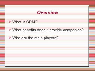 CRM (Customer Relationship Management) software allows companies to better understand their customers through collecting, storing and analyzing customer data across different departments and channels. This integrated approach aims to improve customer service, increase sales and boost profits. Major CRM software providers include Microsoft, Sage and SAP, with packages ranging in price from $5,000 to over $100,000 depending on features. Implementing CRM successfully requires focusing on core customer service goals and ensuring smooth integration with existing systems and processes.
