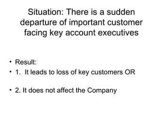 The document discusses customer relationship management (CRM) strategies for companies facing the departure of key account executives. It outlines how consumer behavior has changed, requiring a focus on customer value, satisfaction, and retention through loyalty programs. When key executives depart, companies can retain key customers by rotating employee accounts, organizing customer get-togethers, and maintaining customer databases. Effective CRM involves defining business problems, building marketing databases through data mining, and deploying customer models to improve profitability and market share.