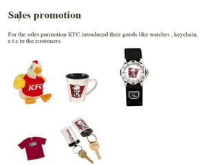 KFC is a fast food chain known for fried chicken that was founded in 1952 in Kentucky. It operates over 20,000 locations globally and has become a segment of Yum! Brands. KFC focuses on chicken pieces, sides, and sandwiches. While its core product is fried chicken, it also offers grilled options and regional variations outside the US. The company uses marketing strategies like targeting families and opening locations in high-income areas. It also employs the 4 P's of marketing - producing signature recipes, competitive pricing, promotions through advertising, and prime high-traffic placement of restaurants. KFC has seen success in India through over 100 locations across major cities and follows CRM practices to engage customers.