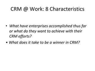 The document outlines 8 key characteristics of a successful CRM implementation: 1) having a clear CRM vision and leadership, 2) developing CRM strategies around objectives, segments, and customer interactions, 3) creating a valued customer experience through understanding needs, monitoring satisfaction, and acting on feedback, 4) fostering organizational collaboration around customer understanding, 5) establishing CRM processes around the customer lifecycle and knowledge management, 6) leveraging CRM information like customer data and analytics, 7) utilizing CRM technology applications and infrastructure, and 8) defining CRM metrics around value, retention, satisfaction and loyalty.